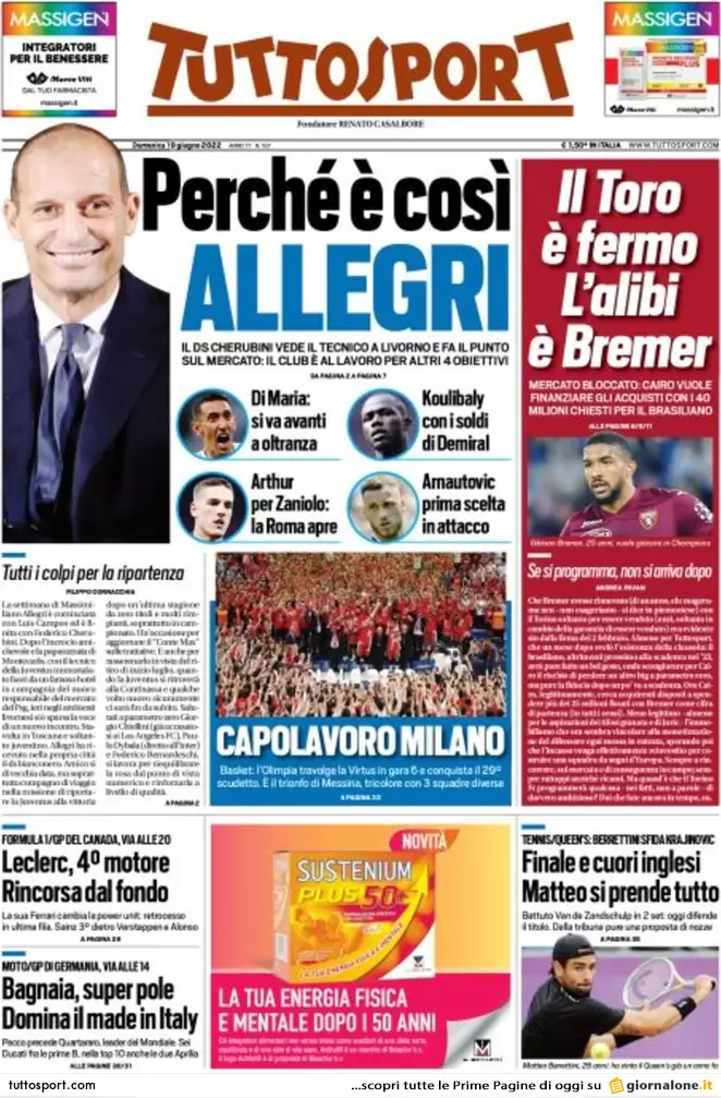 La vittoria di Milano nel Basket, il mercato di Milan, Inter e non solo e molto altro sulle copertine dei giornali odierni