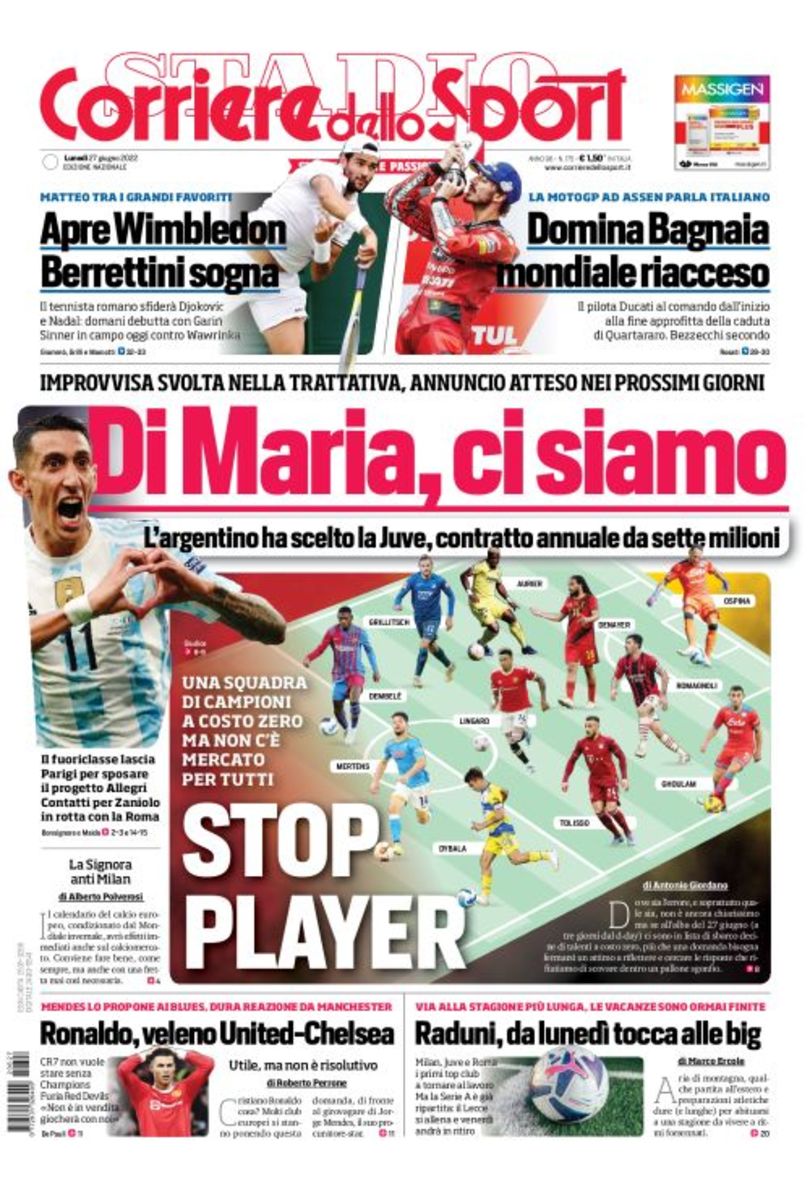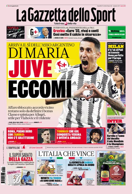C’è tanto calciomercato e in particolare tanto Angel Di Maria sulle copertine odierne dei maggiori quotidiano sportivi nazionali.