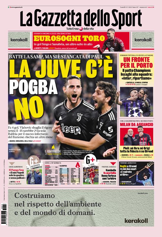 Le prime pagine dei quotidiani sportivi in edicola oggi, lunedƬ 13 marzo 2023.