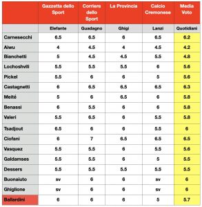 Non promossa, ma nemmeno bocciata in modo grave: la Cremonese vista all’opera contro l’Atalanta rimedia dalla stampa voti che ballano tra il 5.5 e il 6 con picchi in positivi (Daniel Ciofani) e in negativo (Emanuel Aiwu ma anche Matteo Bianchetti). Altri elementi dividono la critica come, ad esempio, Soualiho Meitè i cui voti, a seconda delle testate, variano dal 5 al 6.5. Una prestazione, la sua, difficile da interpretare, come tutta la stagione grigiorossa. Questo il confronto: