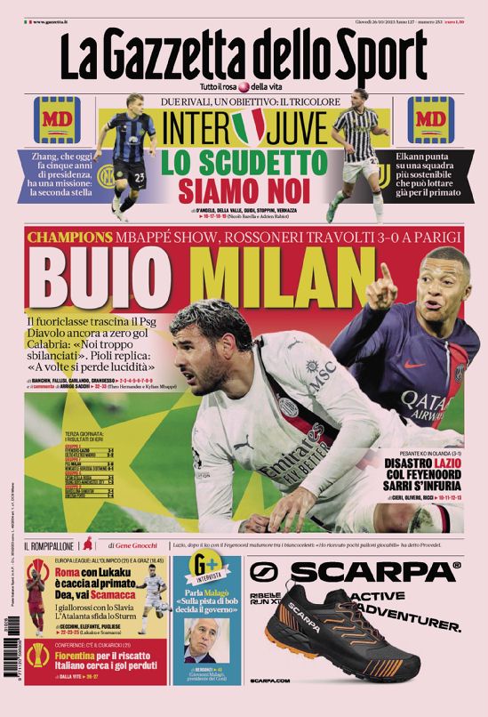 Le prime pagine dei quotidiani sportivi in edicola oggi, giovedƬ 26 ottobre 2023.