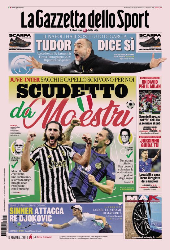Le prime pagine dei quotidiani sportivi in edicola oggi, martedƬ 14 novembre 2023.