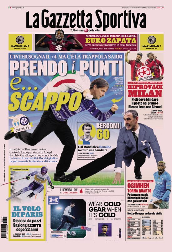 Le prime pagine dei quotidiani sportivi in edicola oggi, domenica 17 dicembre 2023.