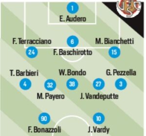 Audero; Terracciano, Baschirotto, Bianchetti; Barbieri, Grassi, Payero, Zerbin, Pezzella, Vardy, Sanabria