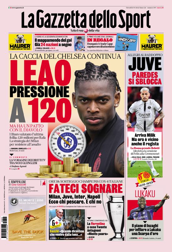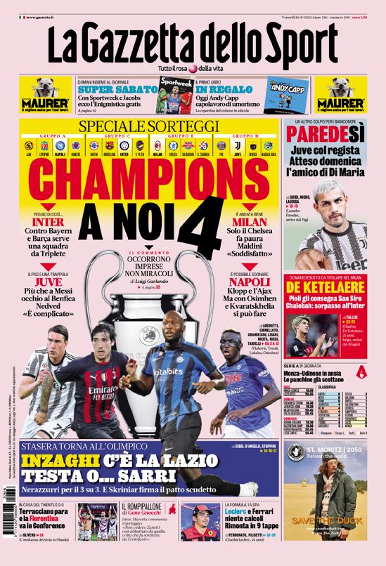 La Champions, il calciomercato e la Serie A: sono loro i grandi protagonisti delle copertine odierne dei maggiori quotidiani sportivi...