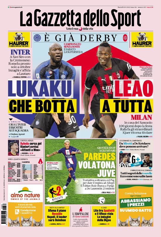 Il derby di Milano, la Serie A e molto altro sulle copertine dei giornali in edicola oggi Ecco le prime...