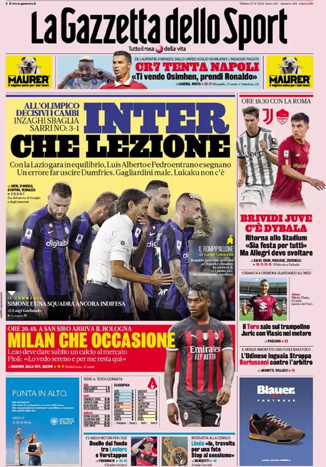 La Lazio batte l’Inter, le partite di Serie A di domani e molto altro sulle copertine dei giornali in edicola...